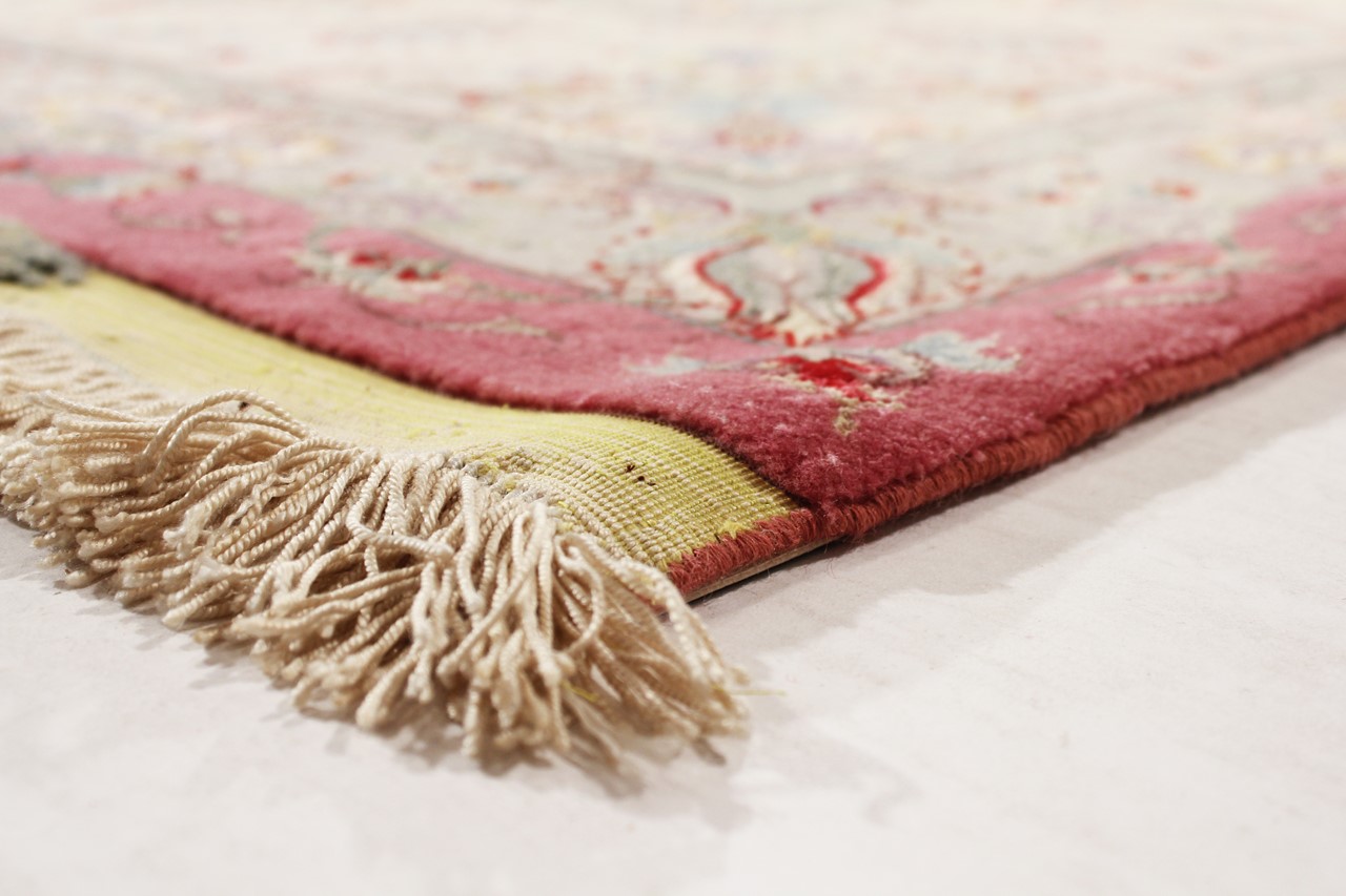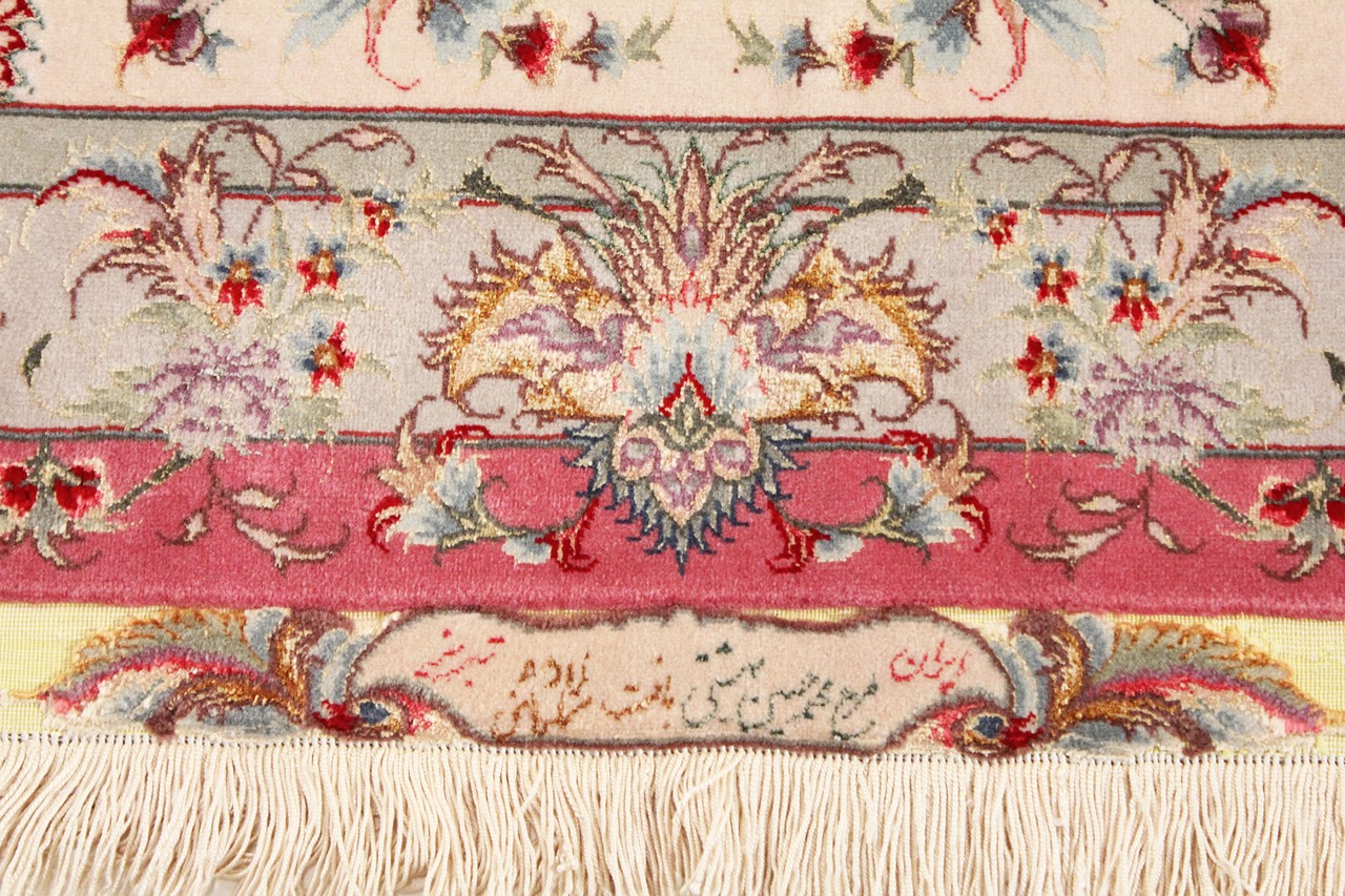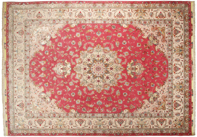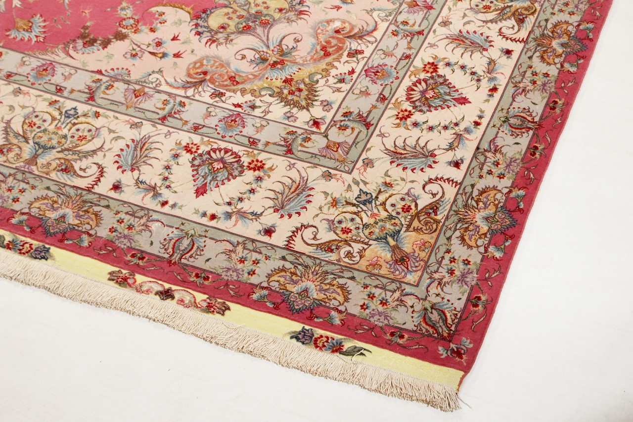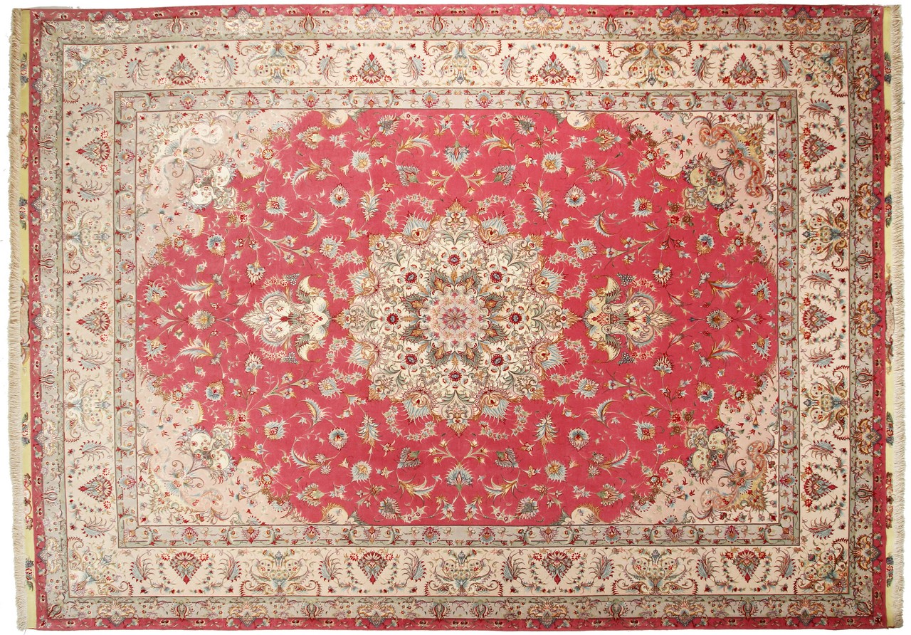 Dieser Täbriz wurde im Nordwesten des Iran, in der handwerklichen und gleichnamigen Stadt Tabriz handgeknüpft. Dabei wurde nur hochwertige Wolle und Naturseide verwendet. Er spiegelt mit seinen Mustern und dekorativen Elementen den Orient in seiner schönsten Form wieder. Täbriz Teppiche sind sehr bekannt und beliebt. Die Raj Anzahl gibt bei diesen Teppichen die Menge der Knoten auf einer Länge von 7cm wieder. So hat ein Täbriz 60Raj zum Beispiel ca. 700.000 Knoten pro Quadratmeter.