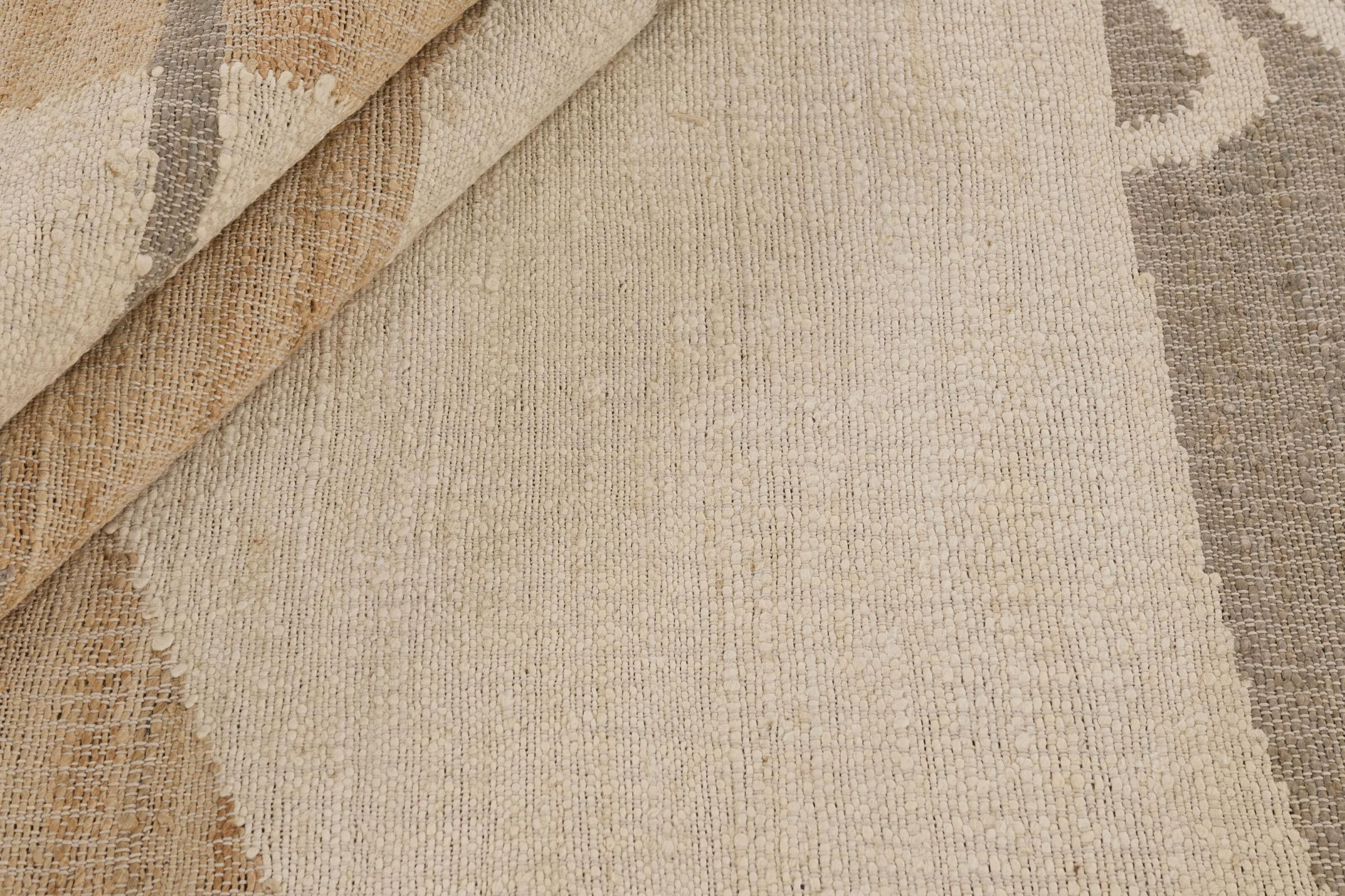 Dieser moderne Kelim überzeugt mit seiner hochwertigen Verarbeitung, die auf der präzisen Webtechnik orientalischer Nomaden basiert. In ihm fließt jahrhundertealte Teppichtradition mit zeitgemäßen Designeinflüssen zusammen. Natürliche Schafwolle verleiht ihm eine robuste, pflegeleichte Struktur mit angenehmer Haptik. Der Kelim ist mit einem modernen Design versehen, das sowohl mit aktuellen Wohntrends als auch mit dem klassischen Einrichtungsstil harmoniert.