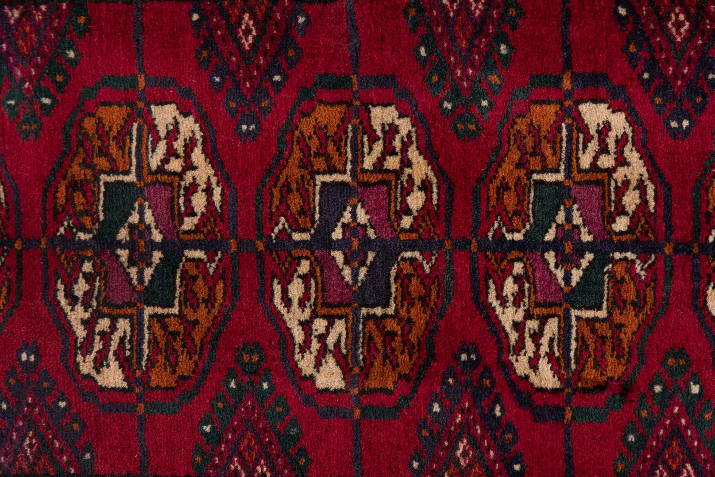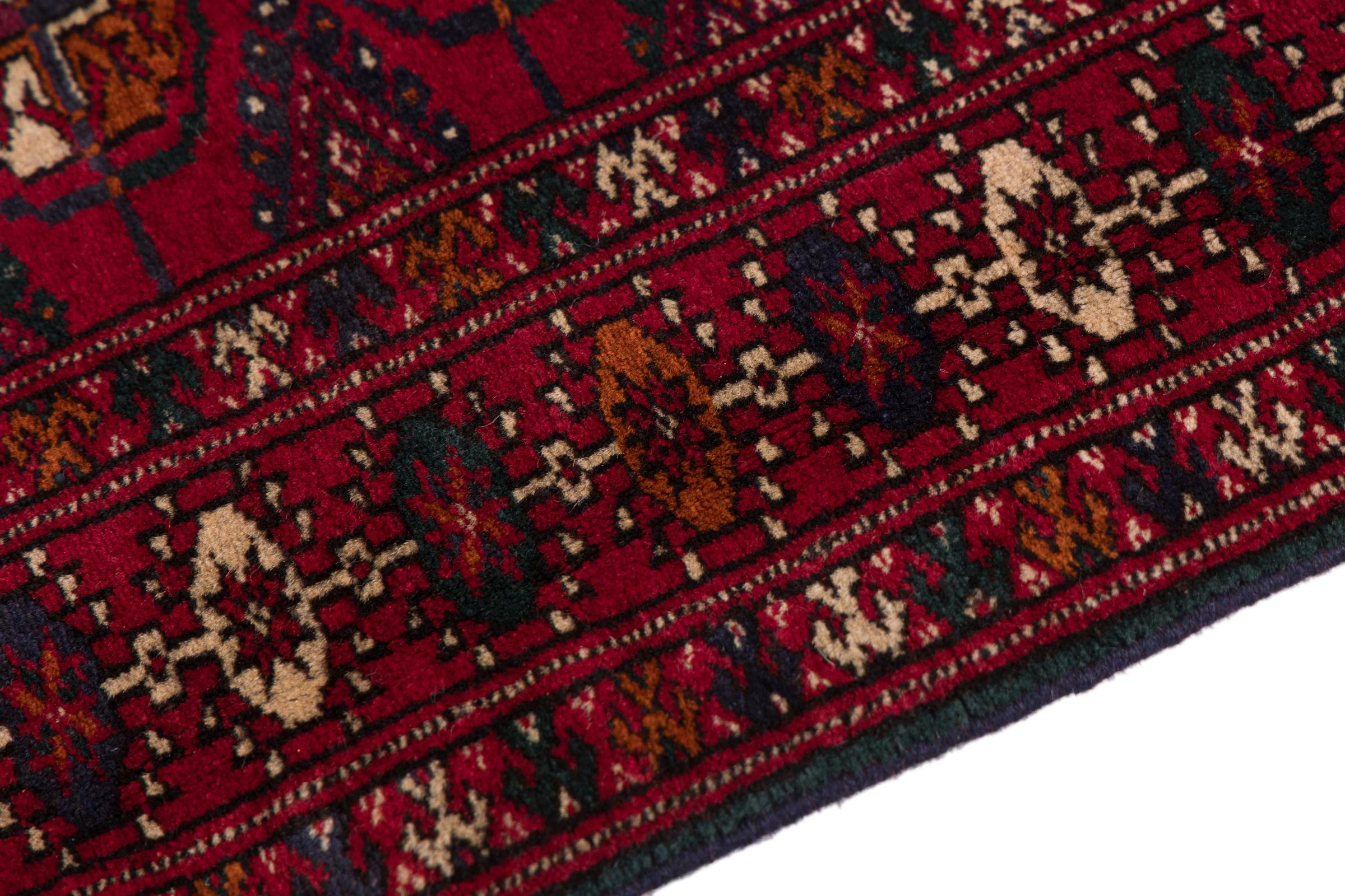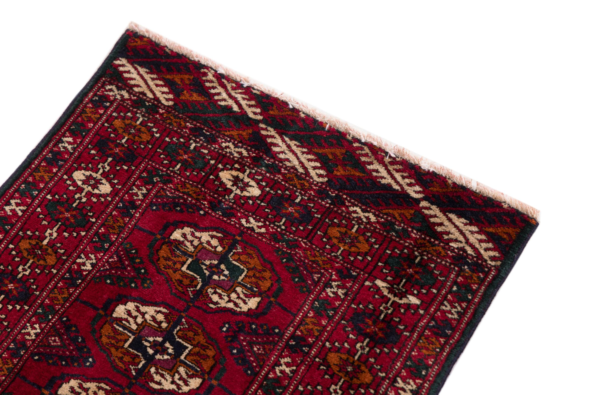 Dieser Turkaman-Teppich wurde in traditioneller Handarbeit geknüpft und überzeugt durch seinen hohen Fertigungsstandard und die hochwertige Schafwolle mit hohem Fettgehalt. Seine dunklen warmen Farben spiegeln die Kultur der Turkmenen wieder und verschaffen ihrem Wohnumfeld einen Hauch von Orient und Gemütlichkeit. Pakistanische Teppiche ähneln dieser Art von Teppich oft, kommen jedoch oft nicht an seine Qualität heran.