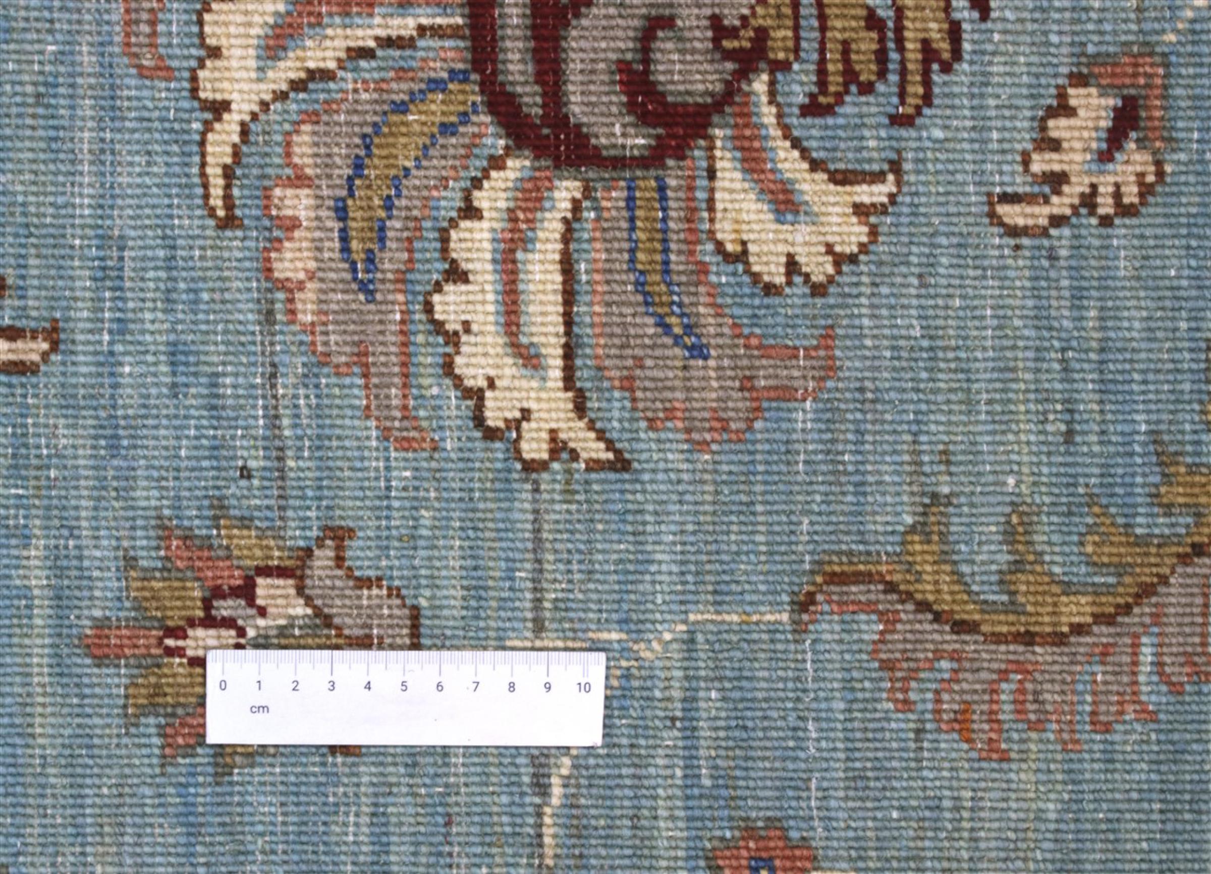 Dieser Teppich besteht aus von Hand gesponnener Schafwolle in höchster Qualitätsstufe. Vor allem im Iran (ehem. Persien), Afghanistan und Pakistan wird Wolle noch von Hand gesponnen, bevor die eigentliche Knüpfung des Teppichs beginnt. Wolle hat sich als natürliches und extrem strapazierfähiges Material über Jahrhunderte hinweg bewährt. Sie besitzt unter Anderem schmutzabweisende und wärmedämmende Eigenschaften. Zugleich ist Wolle unvergleichlich weich und bringt einen natürlichen Glanz mit sich.