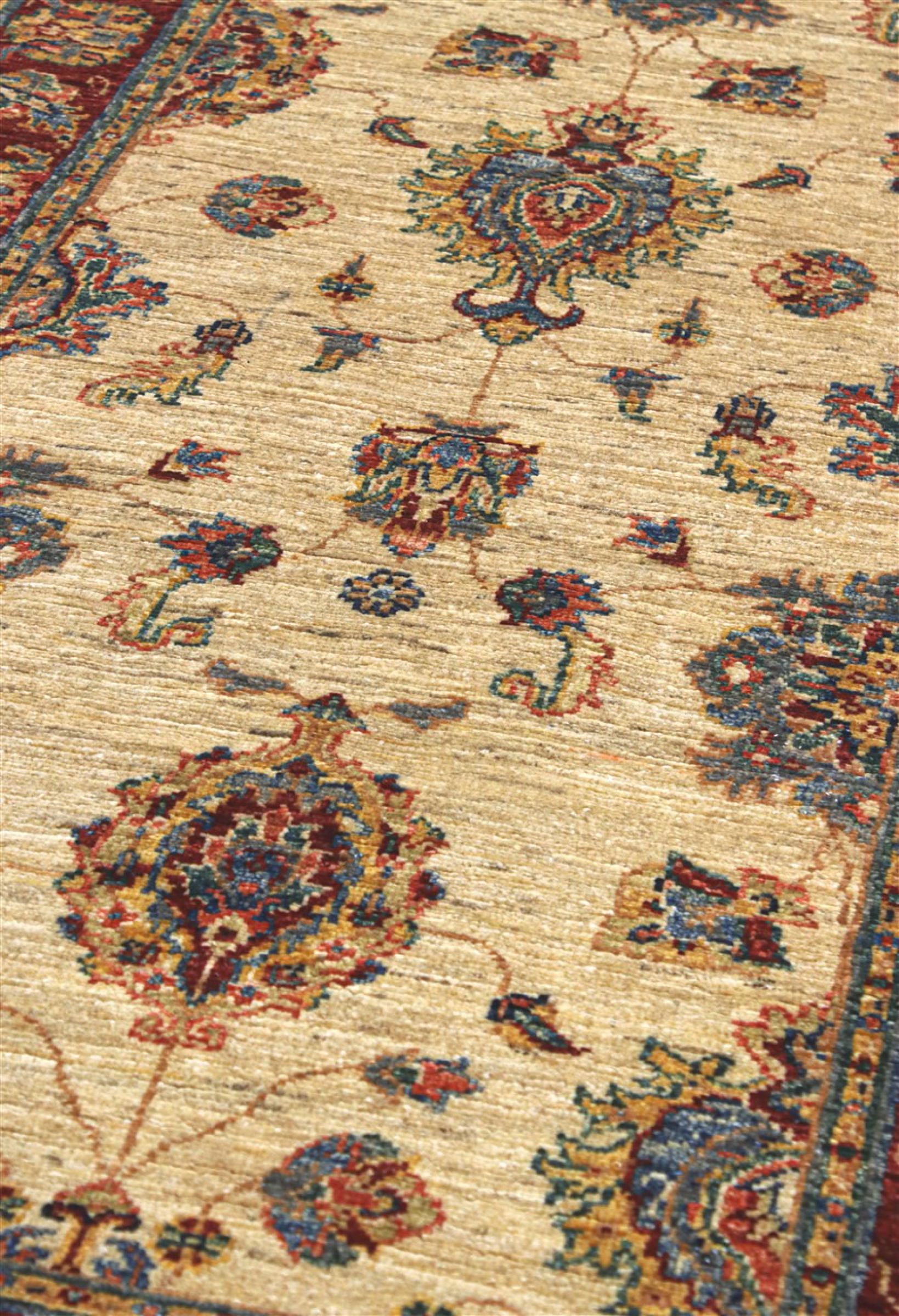 Dies ist ein wunderschöner klassischer Ziegler Teppich. Er wurde von Hand in Afghanistan geknüpft und besteht aus weicher handgesponnener Schafwolle. Florale Ornamente, lebhafte Farben und eine breite Bordüre zeichnen diese Teppiche aus. Oft bekommt der Flor zudem einen leicht ausgewaschenen Look, um einen antiken